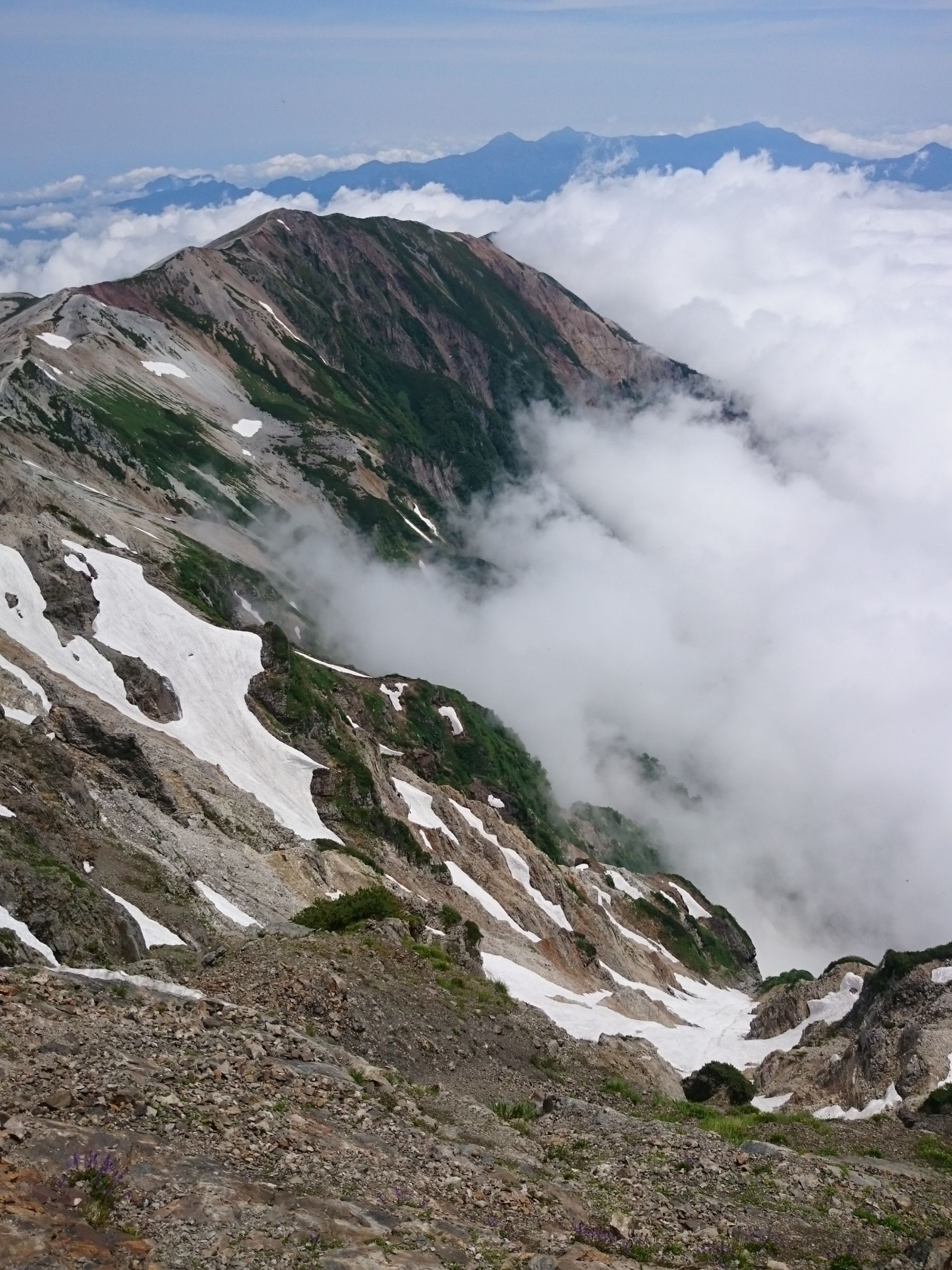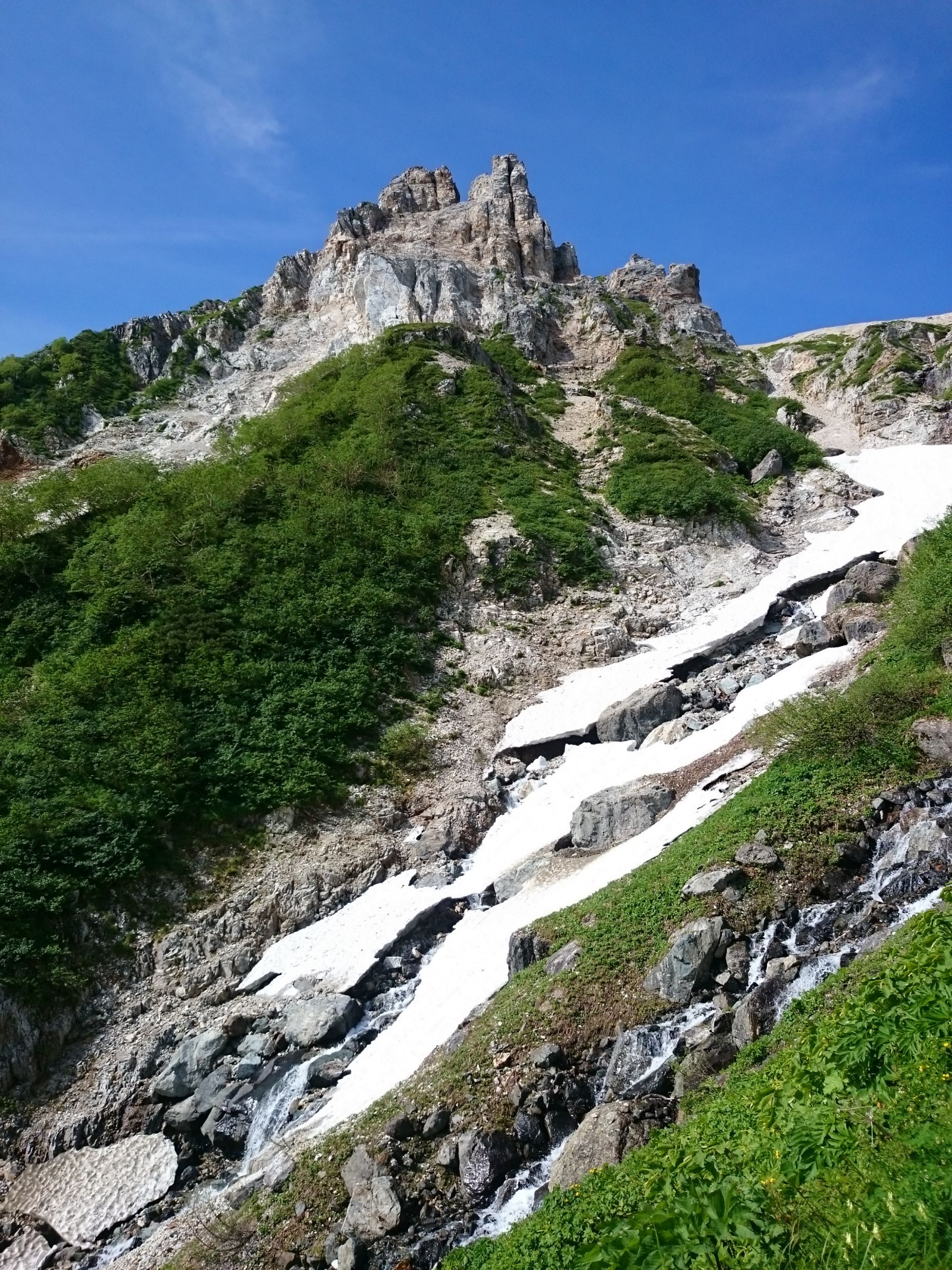 北アルプスの名峰 白馬岳 2016/07/23 少し前になりますが、7月10日(日)に長野・新潟・富山の三県境近くにある 北アルプスの名峰『白馬岳(2932m)』に登ってきました。 今回歩いたのは「白馬大雪渓」という残雪の谷間を登るコース。 青空に向かって伸びる真っ白な雪渓を登るのは実に爽快でした! たっぷり汗を掻きながら雪渓を登り切った先には、お花畑が広がります。 キンポウゲやハクサンイチゲ、クルマユリにウルップソウなどなど、 カラフルな高山植物たちが咲く美しい世界を堪能しました~(^^)/