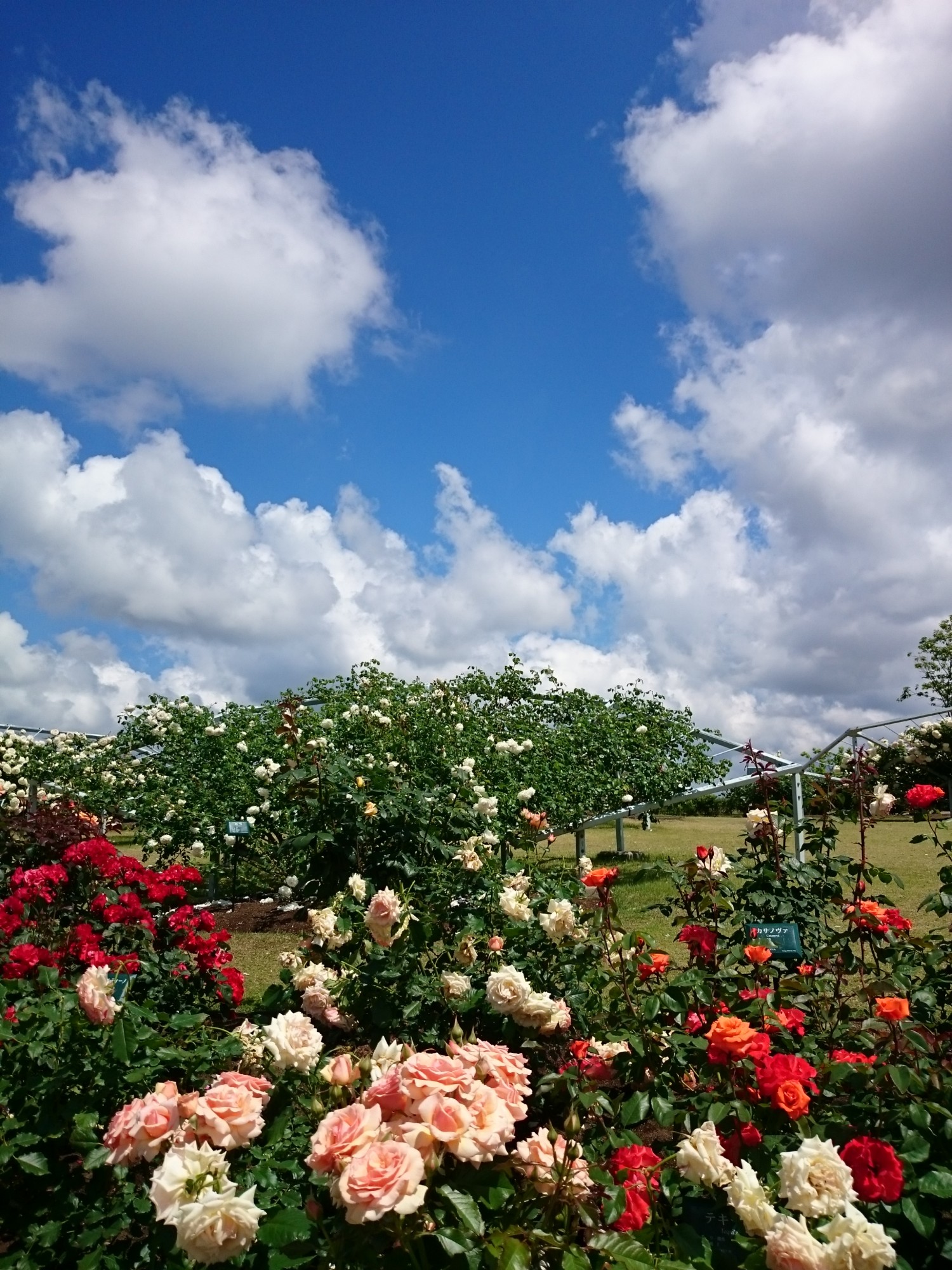 そんな青空をバックに、見頃を迎えた大小さまざまなバラたちが、