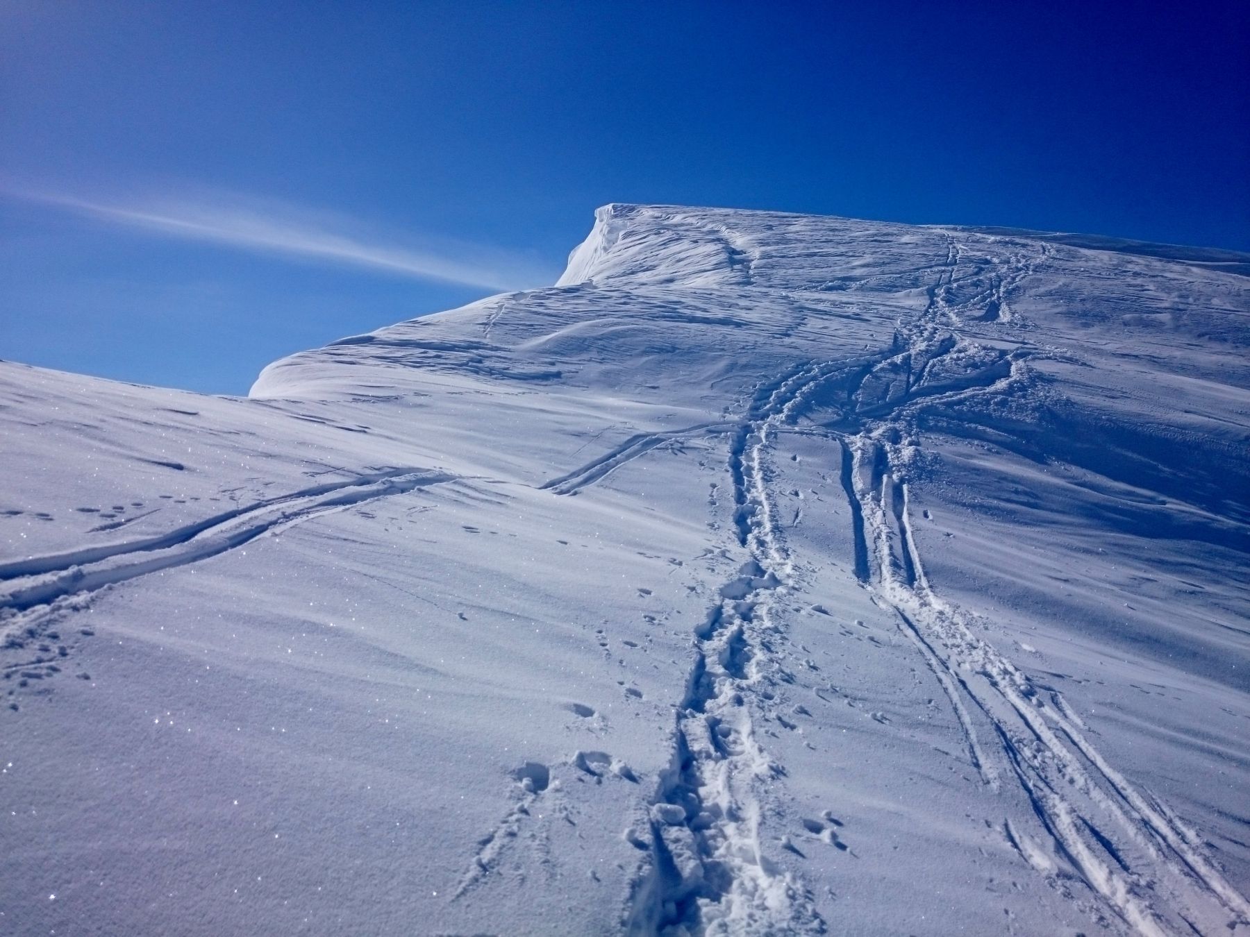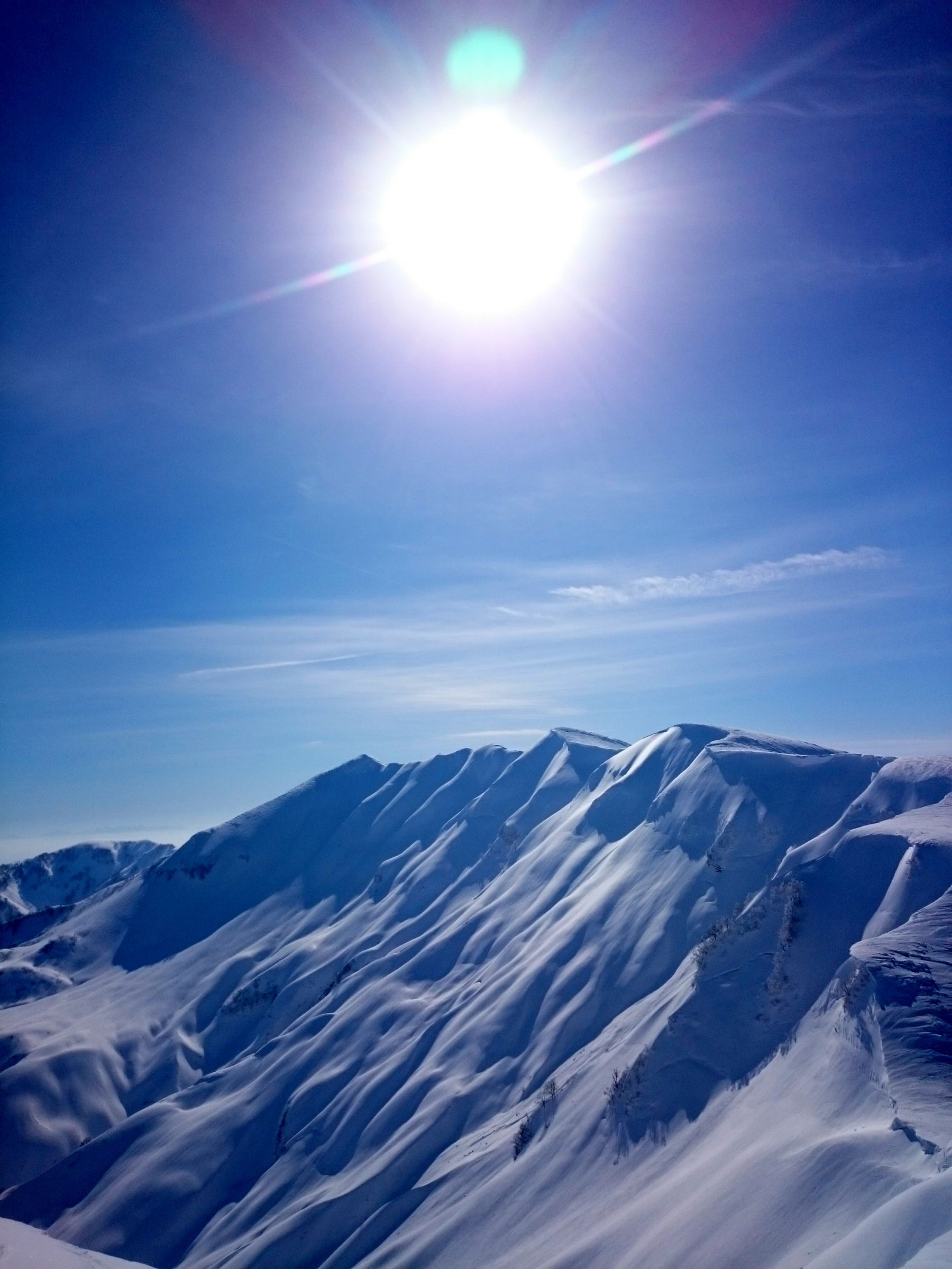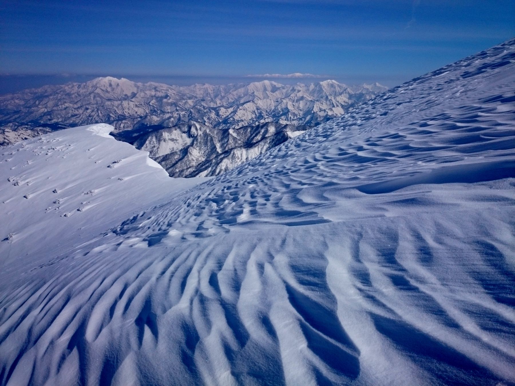 大岳からは最高峰「袴岳」まで稜線が続き、そこには美しい大雪庇が連なります。