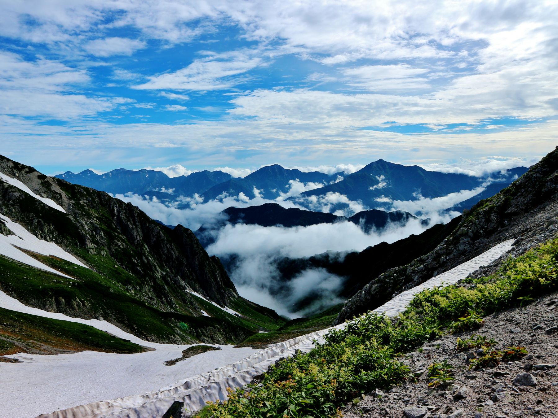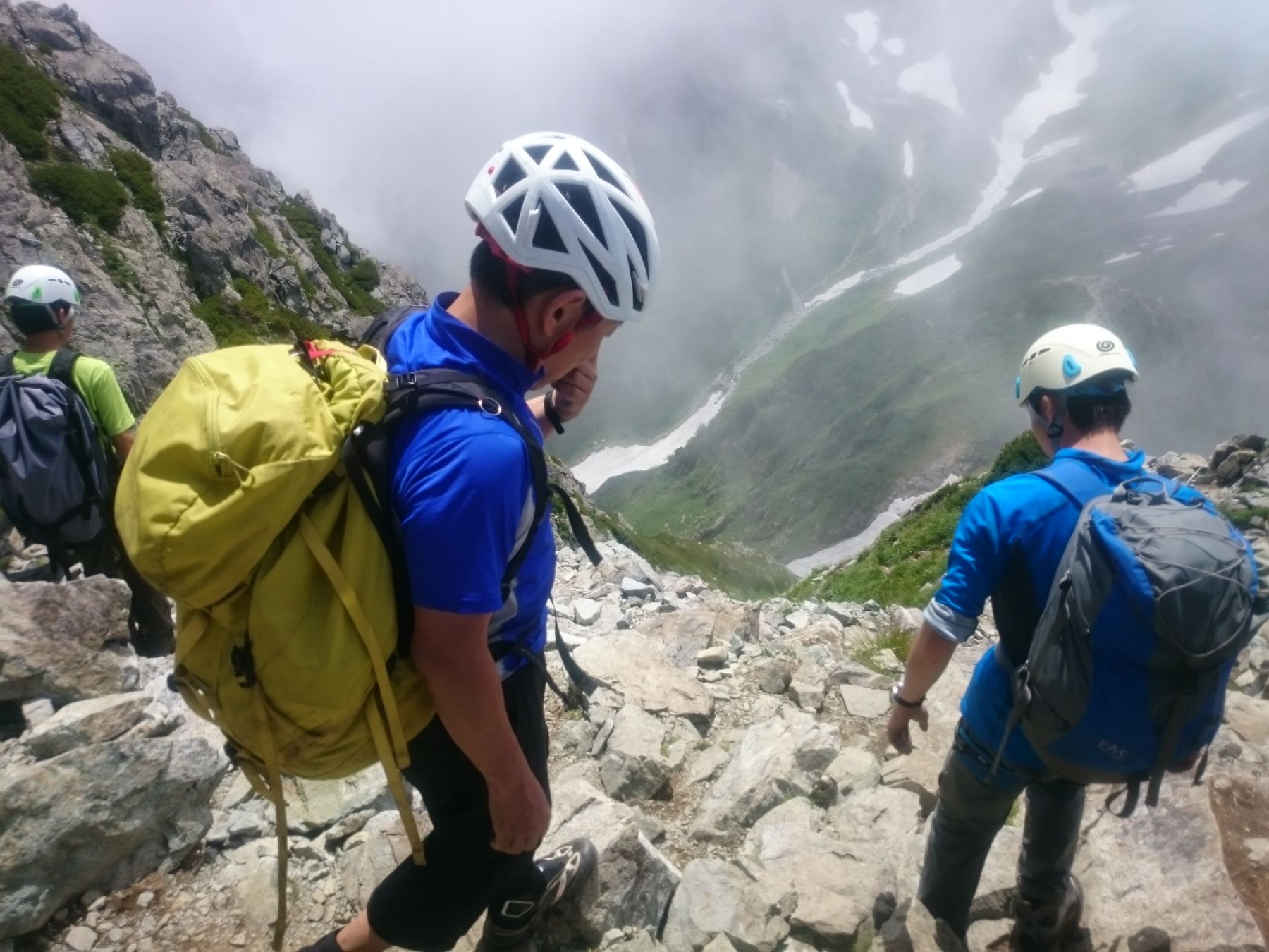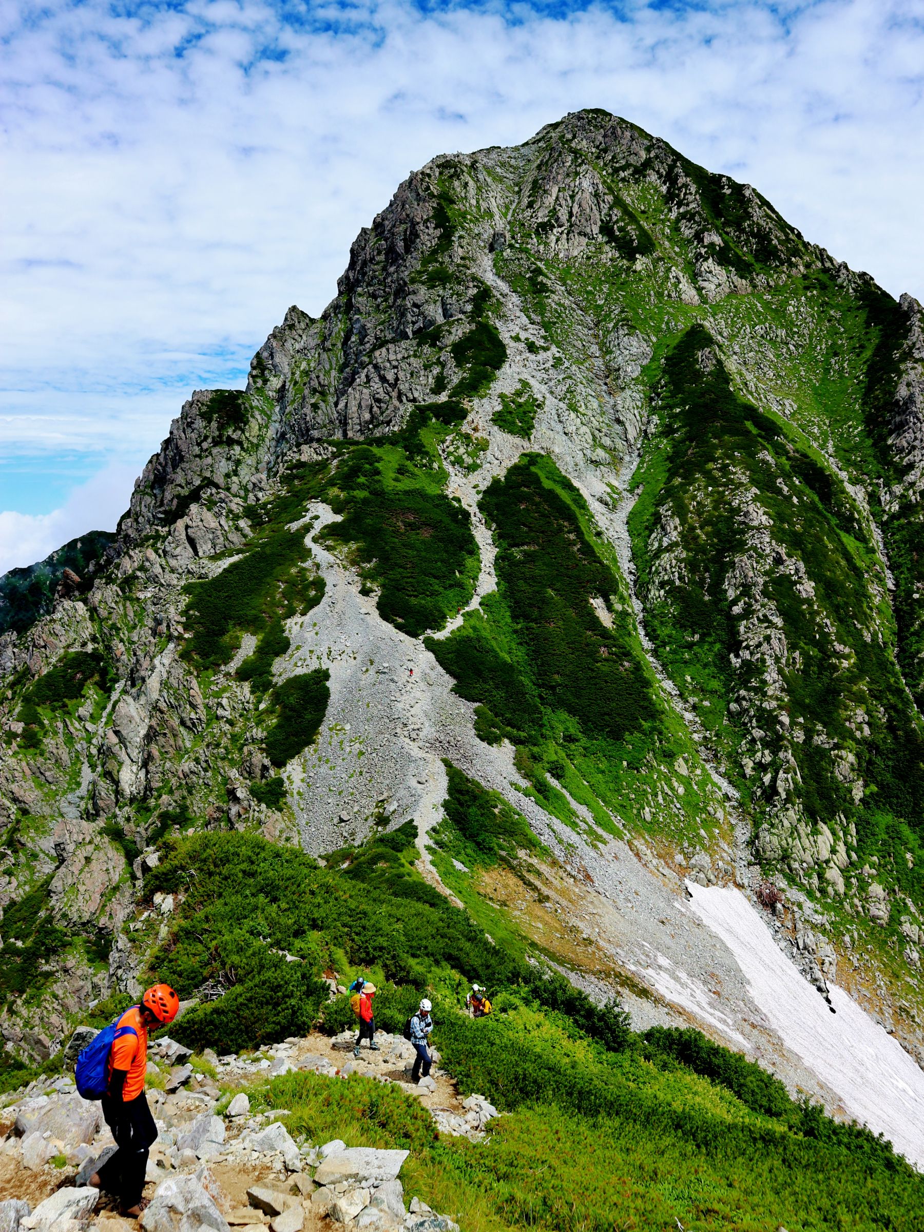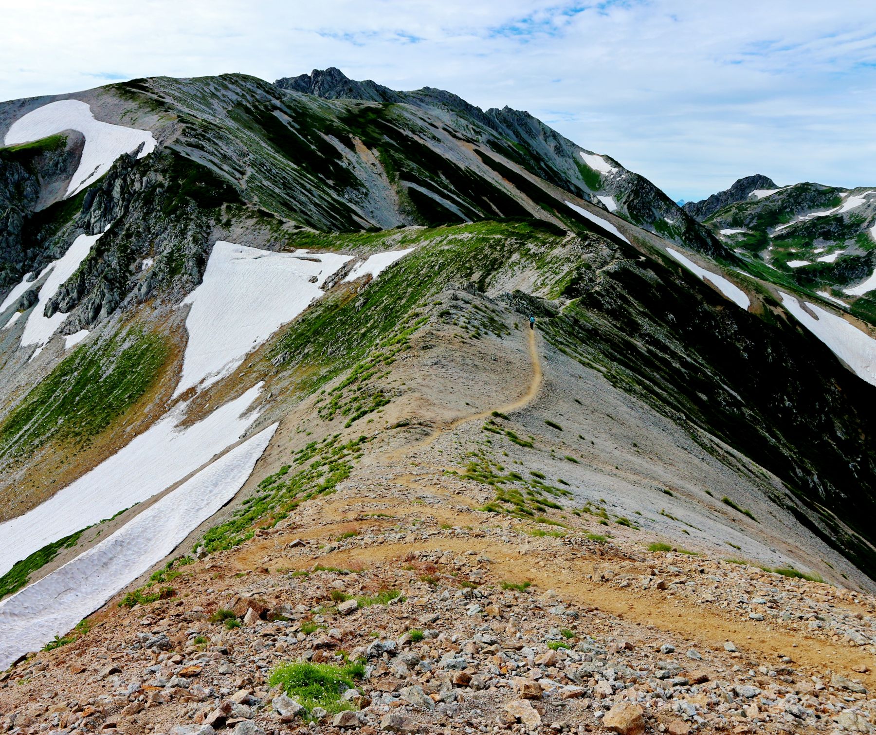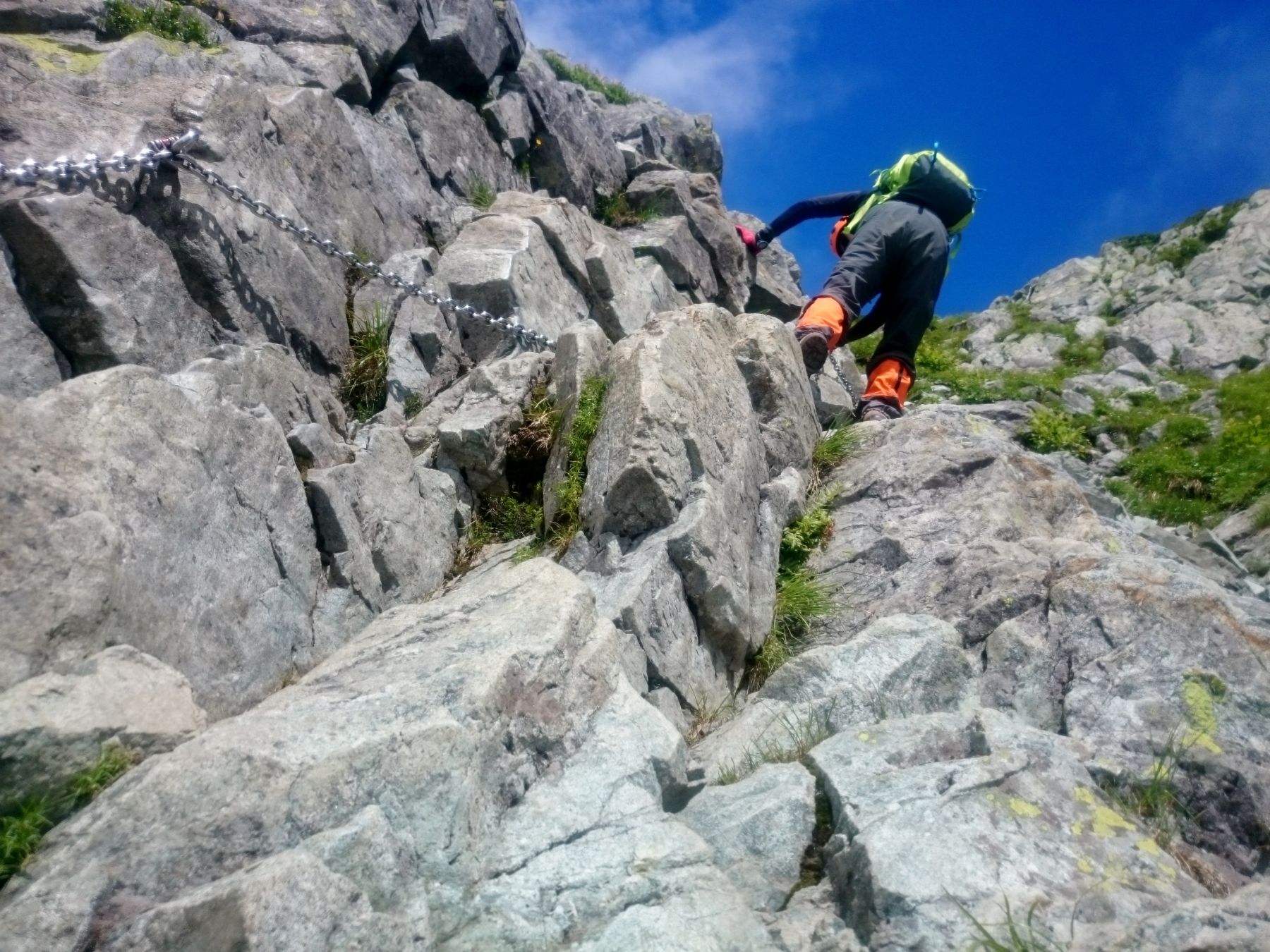雪渓を渡り、ガレ場や鎖場の急斜面がひたすら続きます。