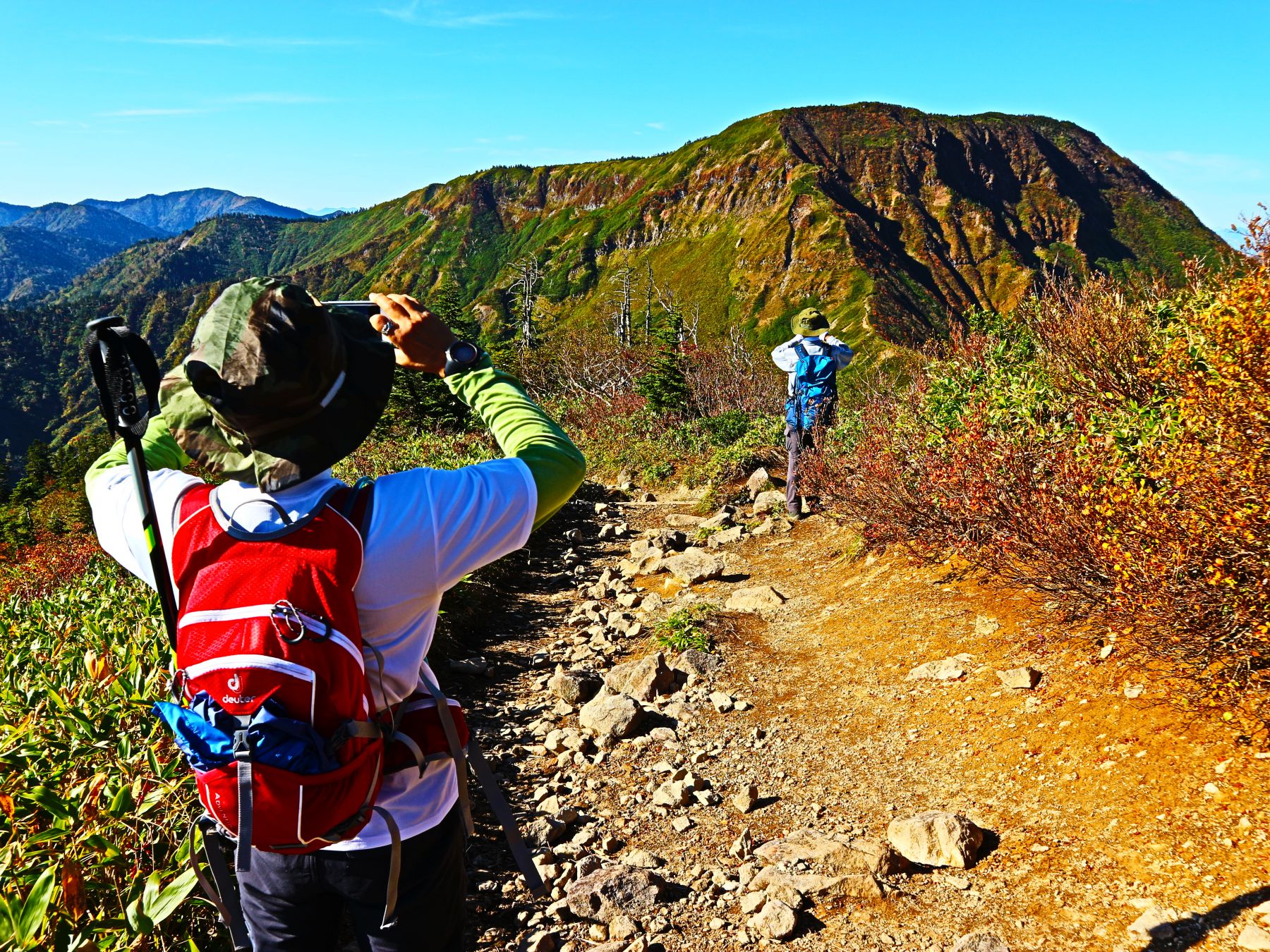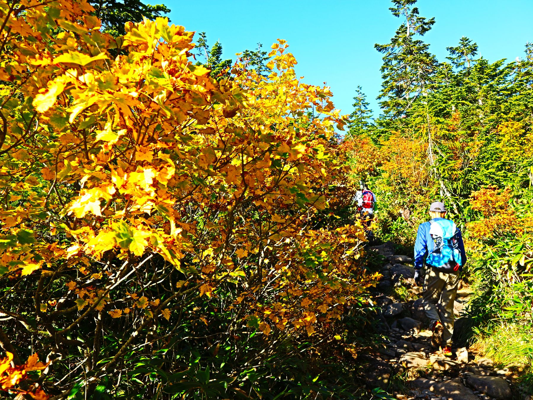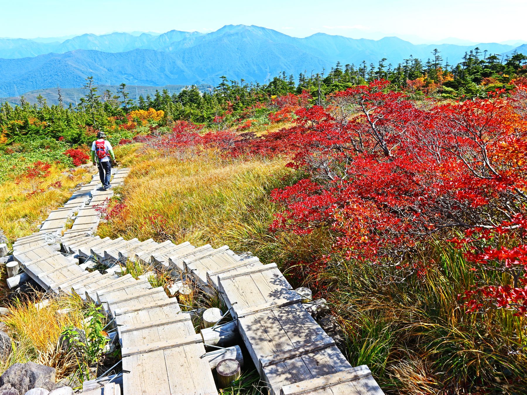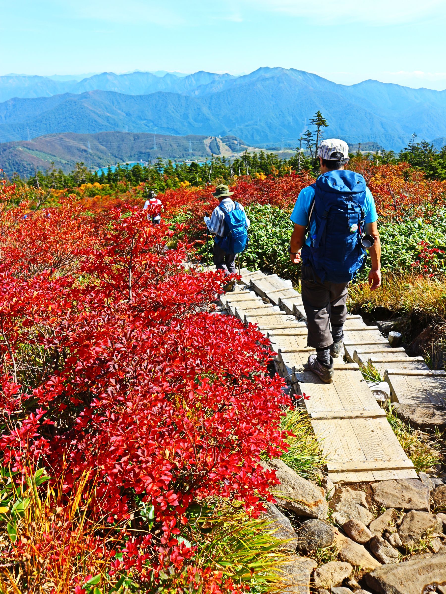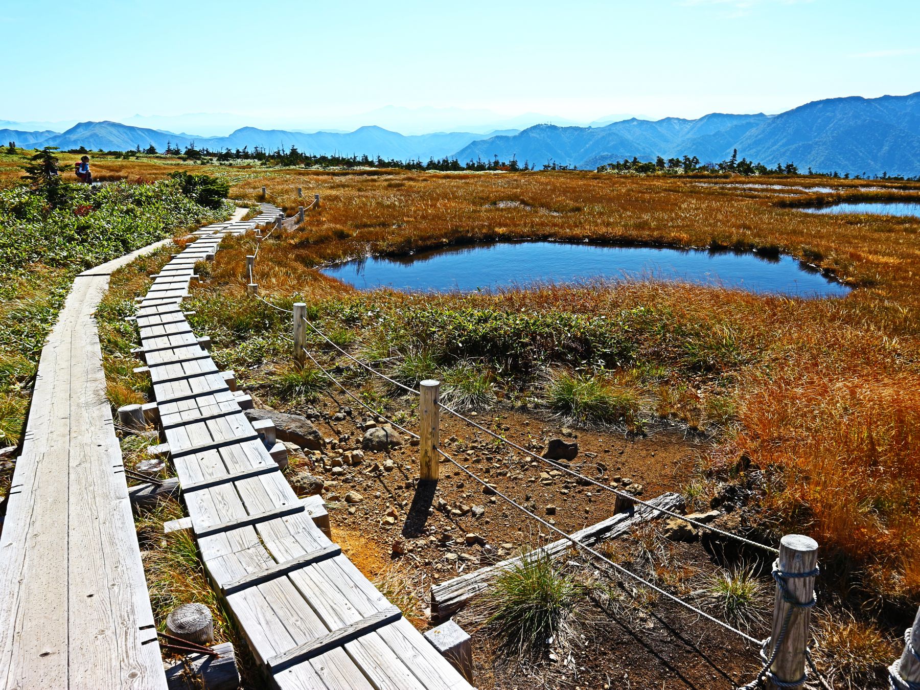 草紅葉となった高層湿原の中、数多くの池塘にはディープブルーとなった秋の青空が反射し、