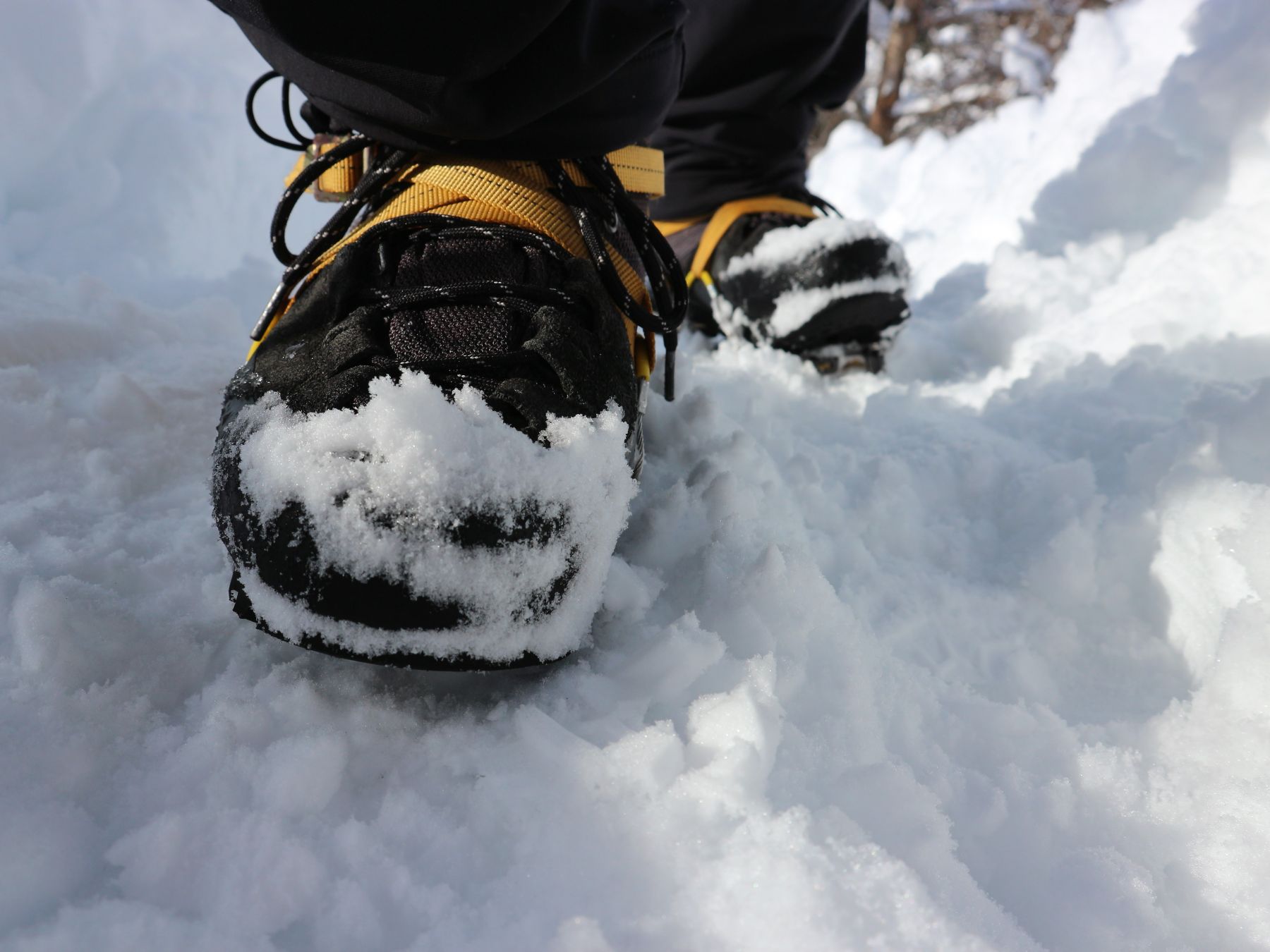 登山道は完全に雪道のため、滑り止めの6本爪アイゼンを履いて出発。