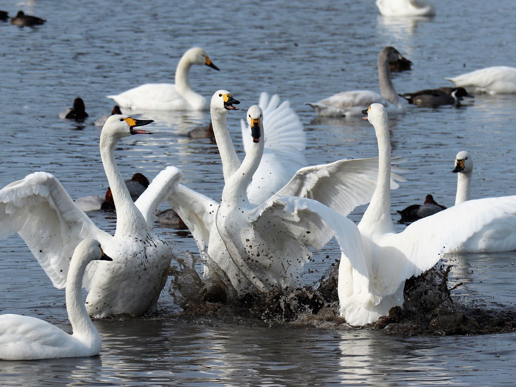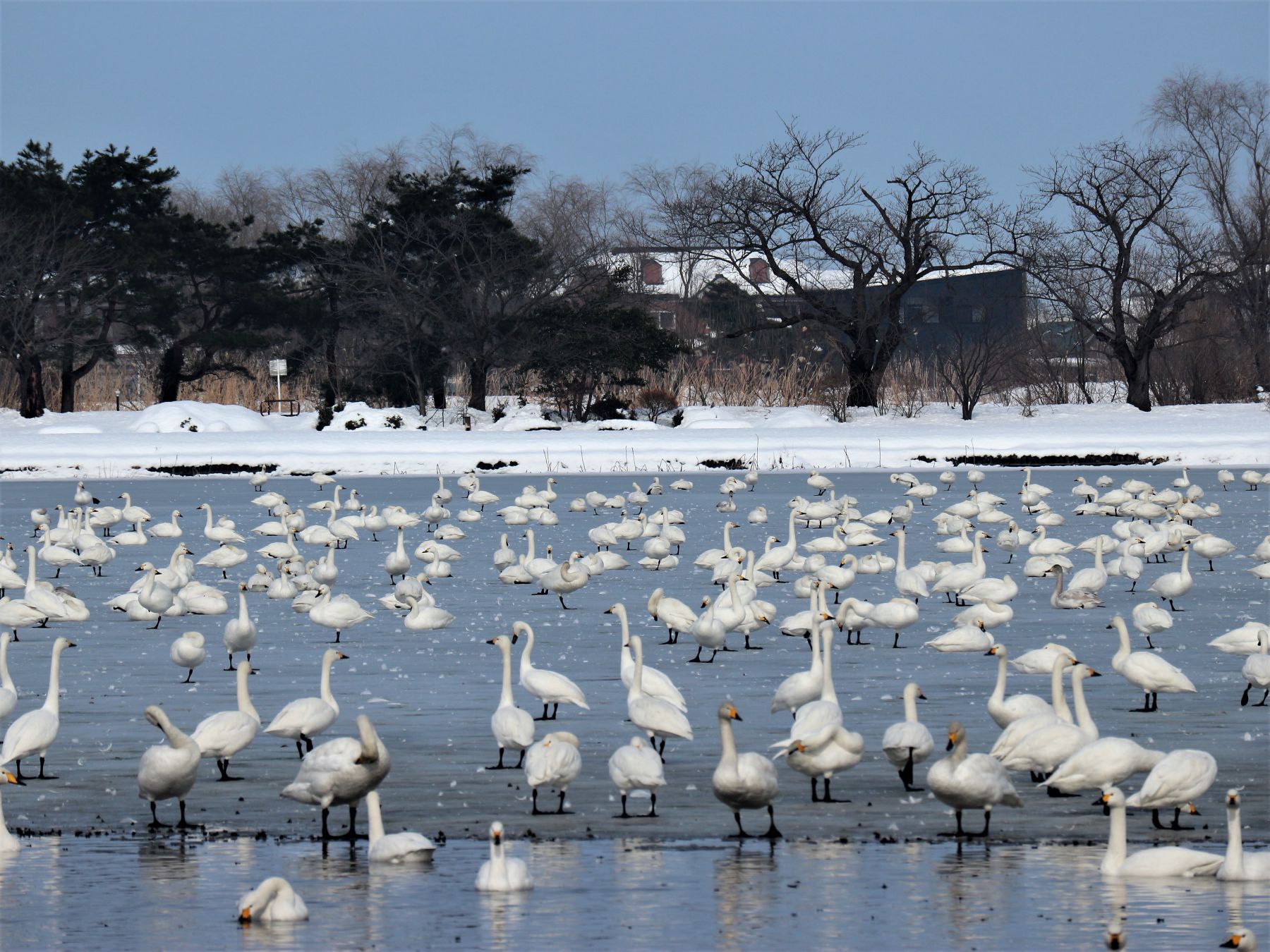 数多くの白鳥たちが餌をあさったり、羽を休めたりしていました。