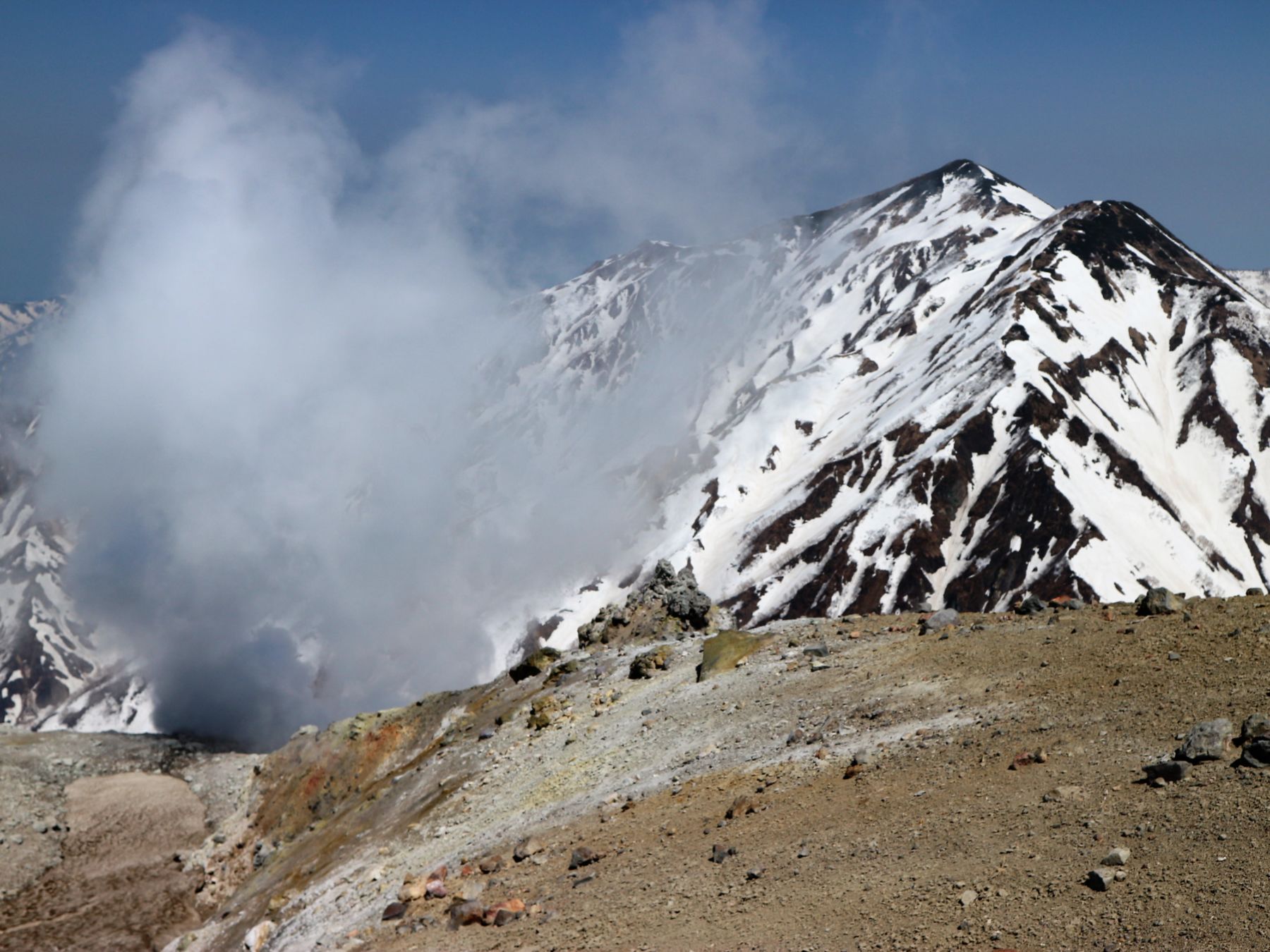 誰もいないたった1人の山頂。奥では噴煙が音を出して吹き出し、