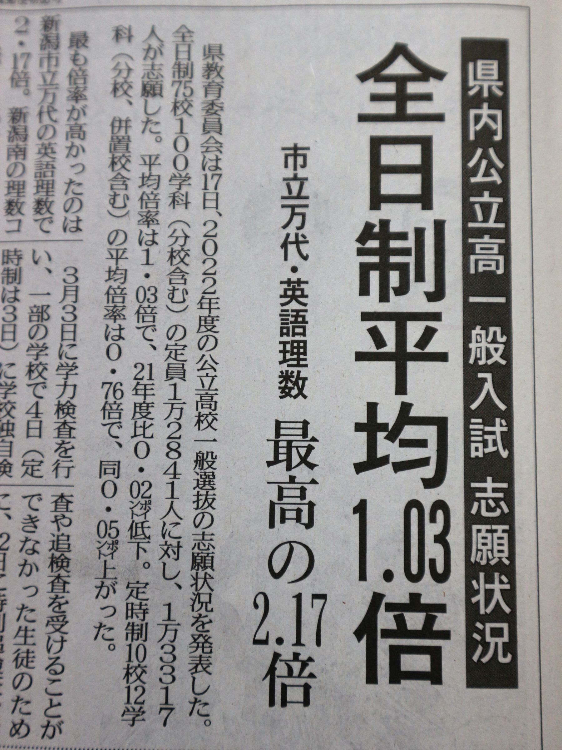 2月17日(木)、県教育委員会から2022年度公立高校一般選抜の