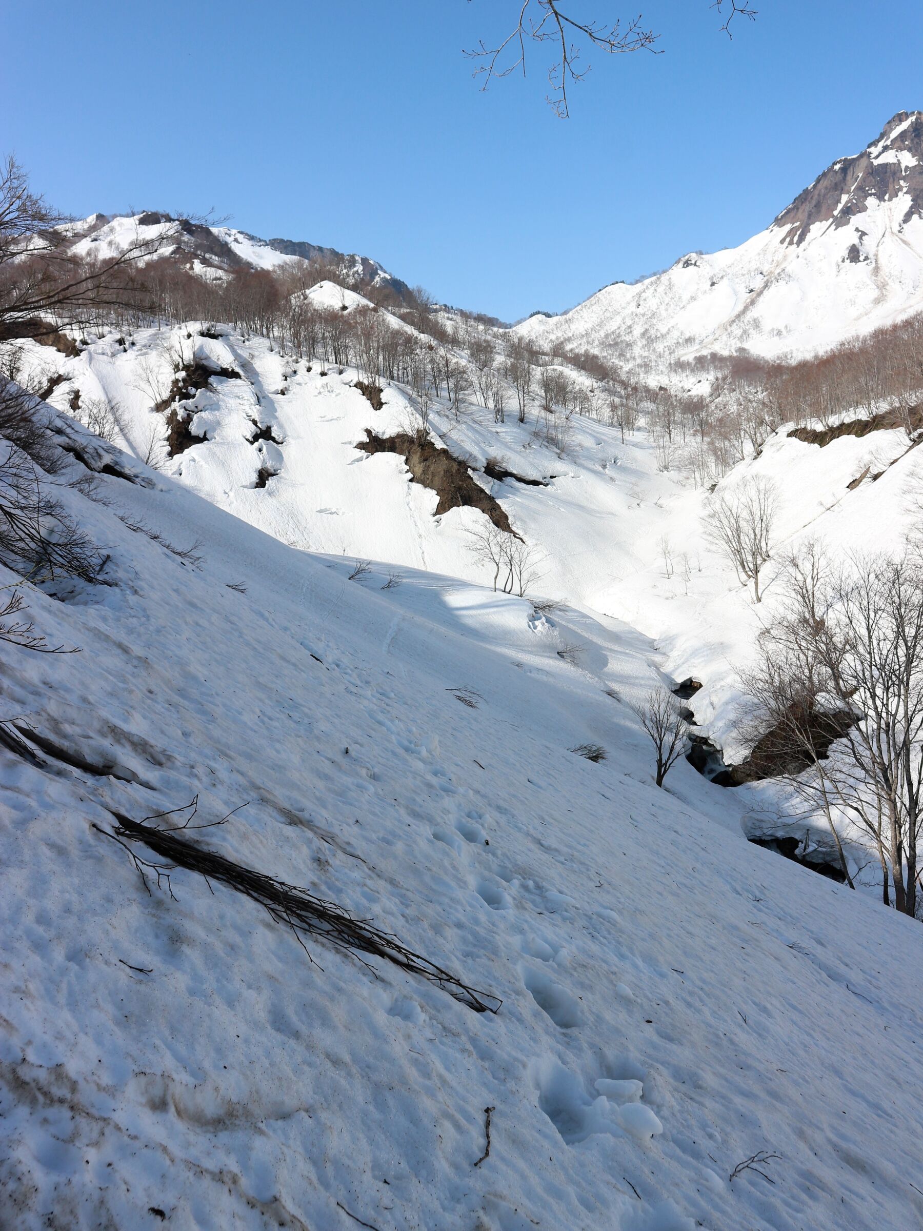急斜面のトラバースでは30m下の沢まで足元が切れ落ち、緊張しながら横断しました。