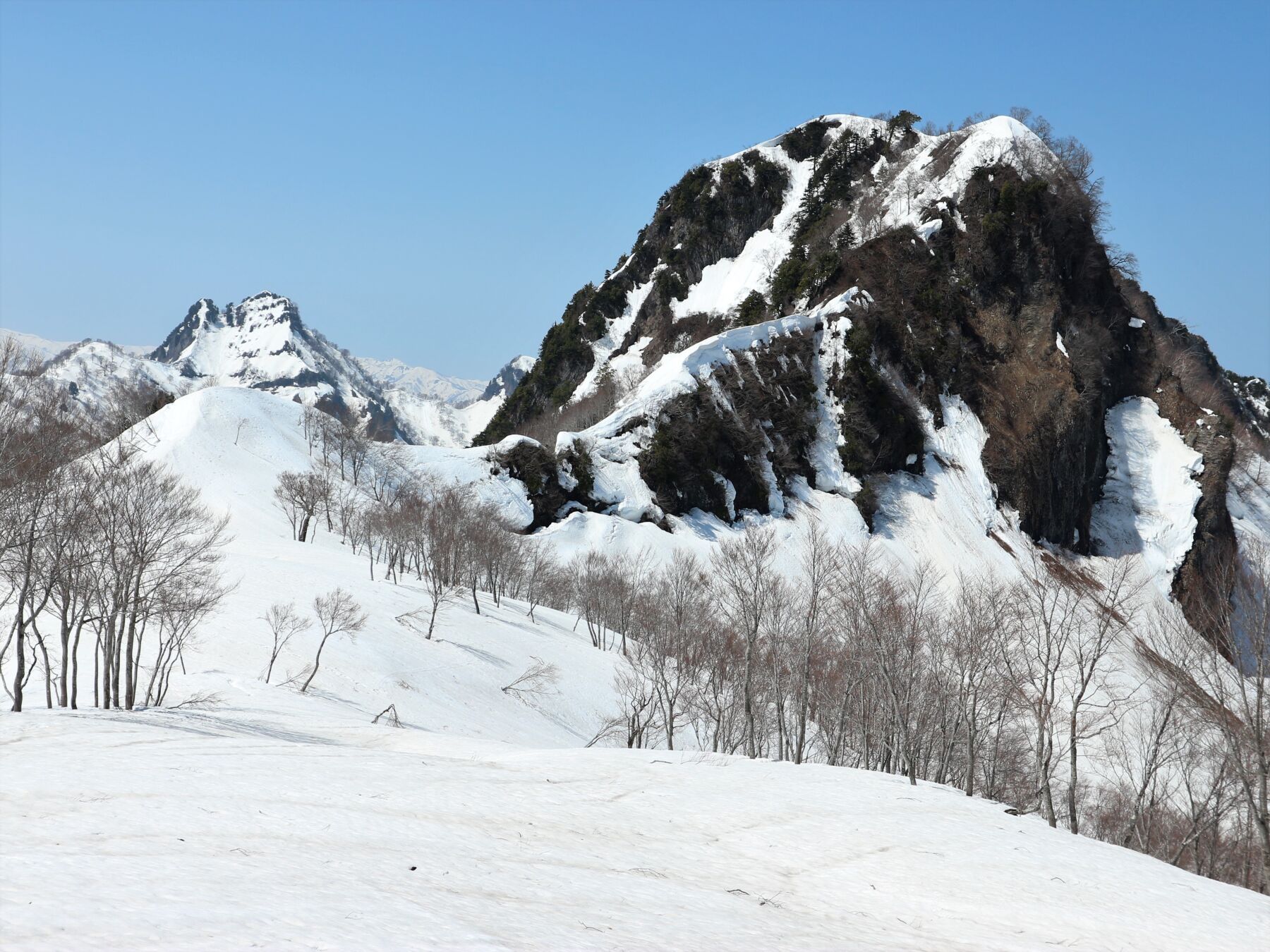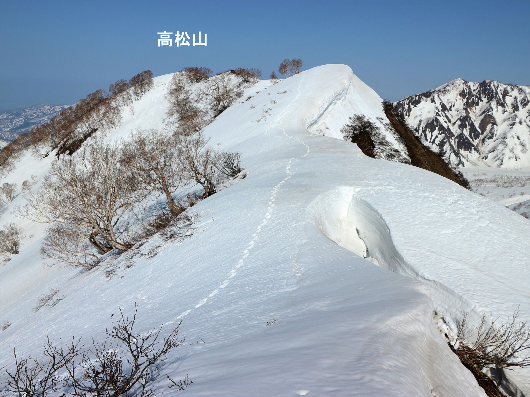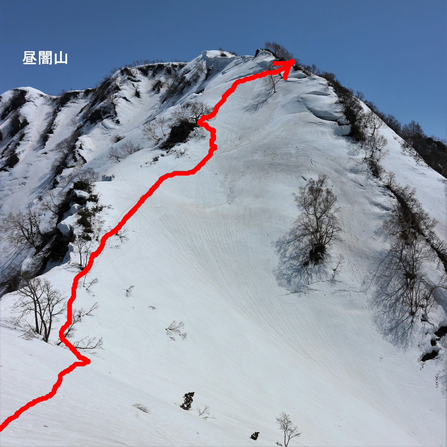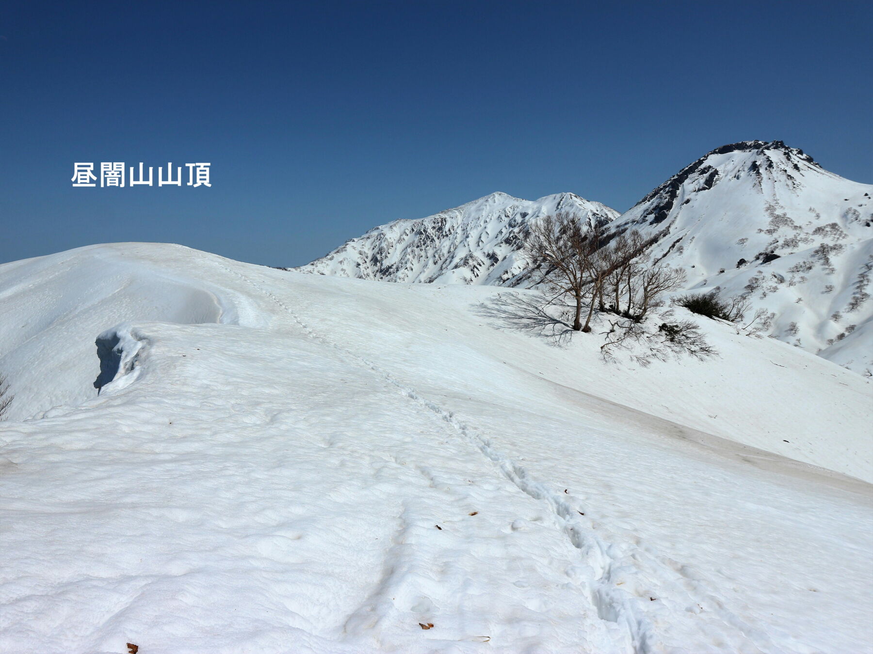 標高は昼闇山が1841m、高松山が1725m。どちらも登山道は存在せず、残雪を利用して登る