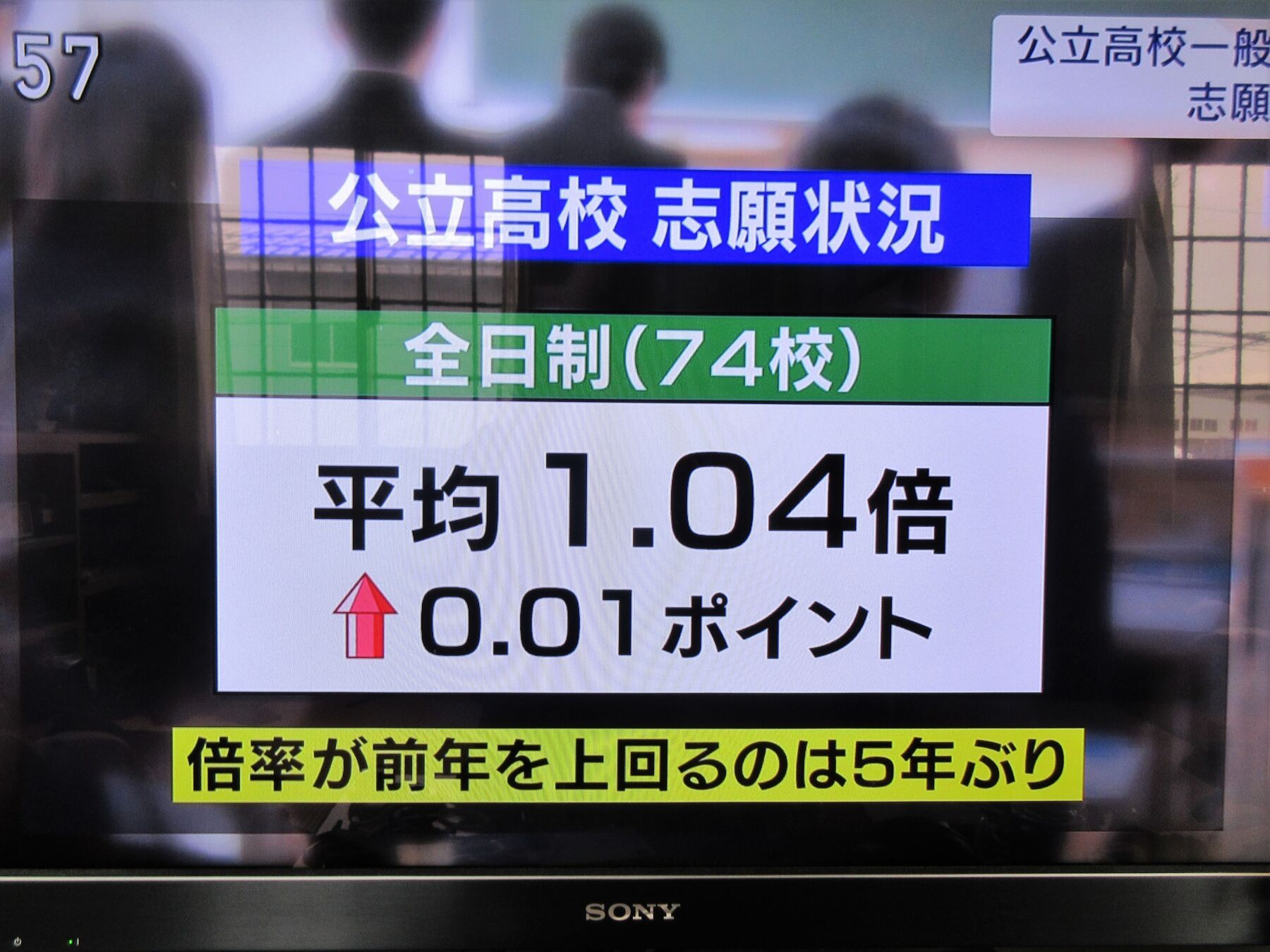 全日制74校97学科の平均倍率が1.04倍で、5年ぶりに前年を上回ったとのことです。