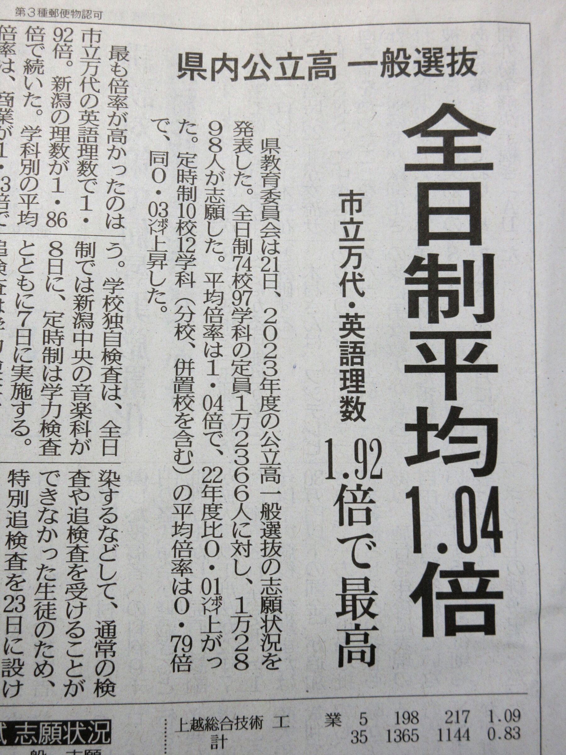 2023年2月21日(火)、公立高校の志願状況、いわゆる「中間倍率」が発表されました。