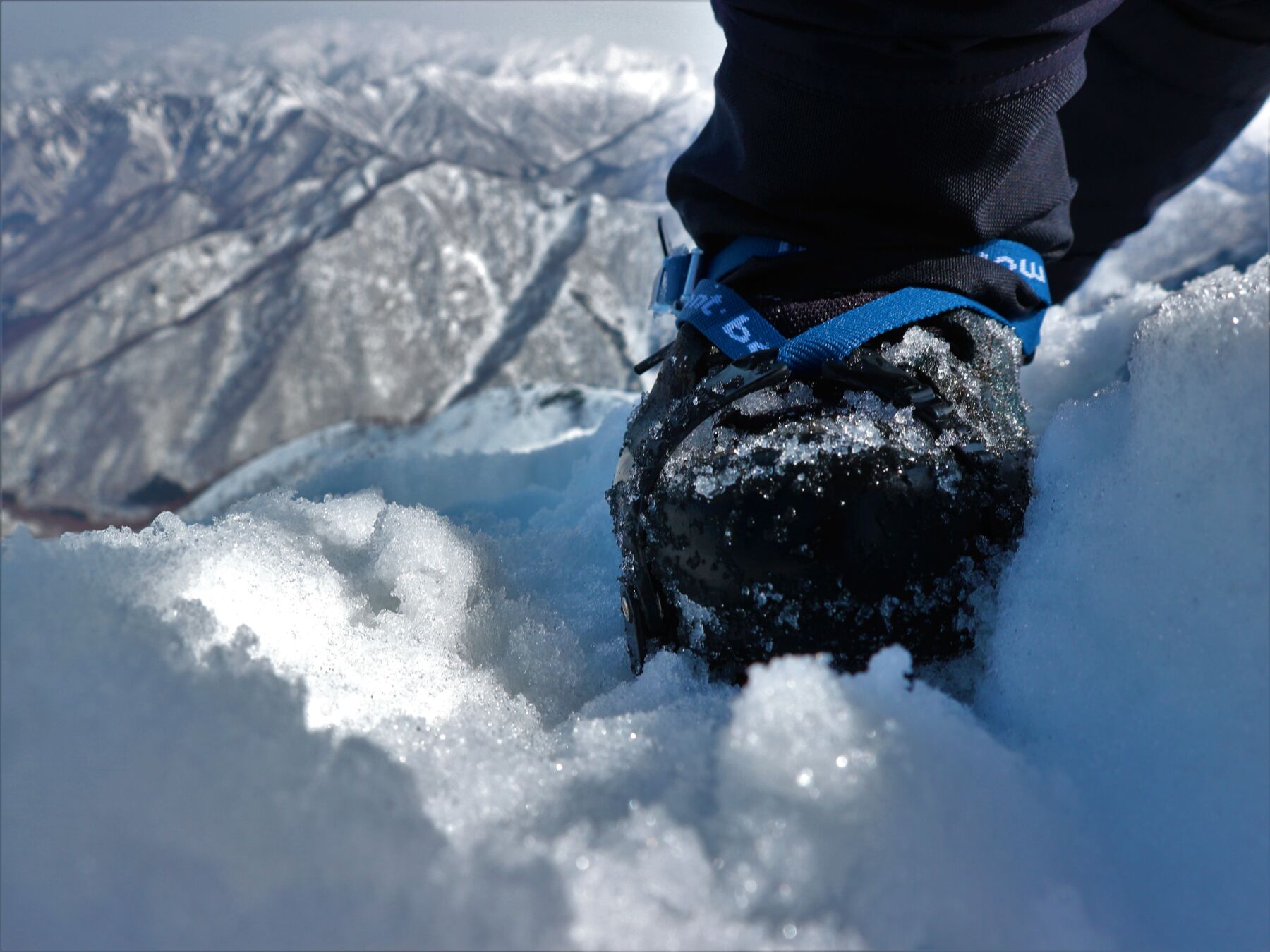 通常、こうした難度の高いルートには、前爪がついた12本爪アイゼンを