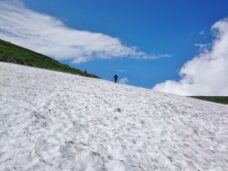 コース途中、「心字雪」と呼ばれる大雪渓を歩きましたが、雪融けと同時に