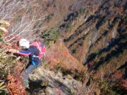 深く切れ落ちた渓谷の斜面にえぐって作られた登山道、足元は数十メートル下の沢まで切れ落ち、