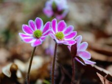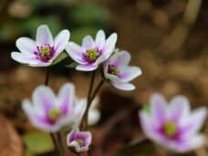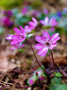里山の斜面に一面に咲いているかわいらしい雪割草を愛でながら、