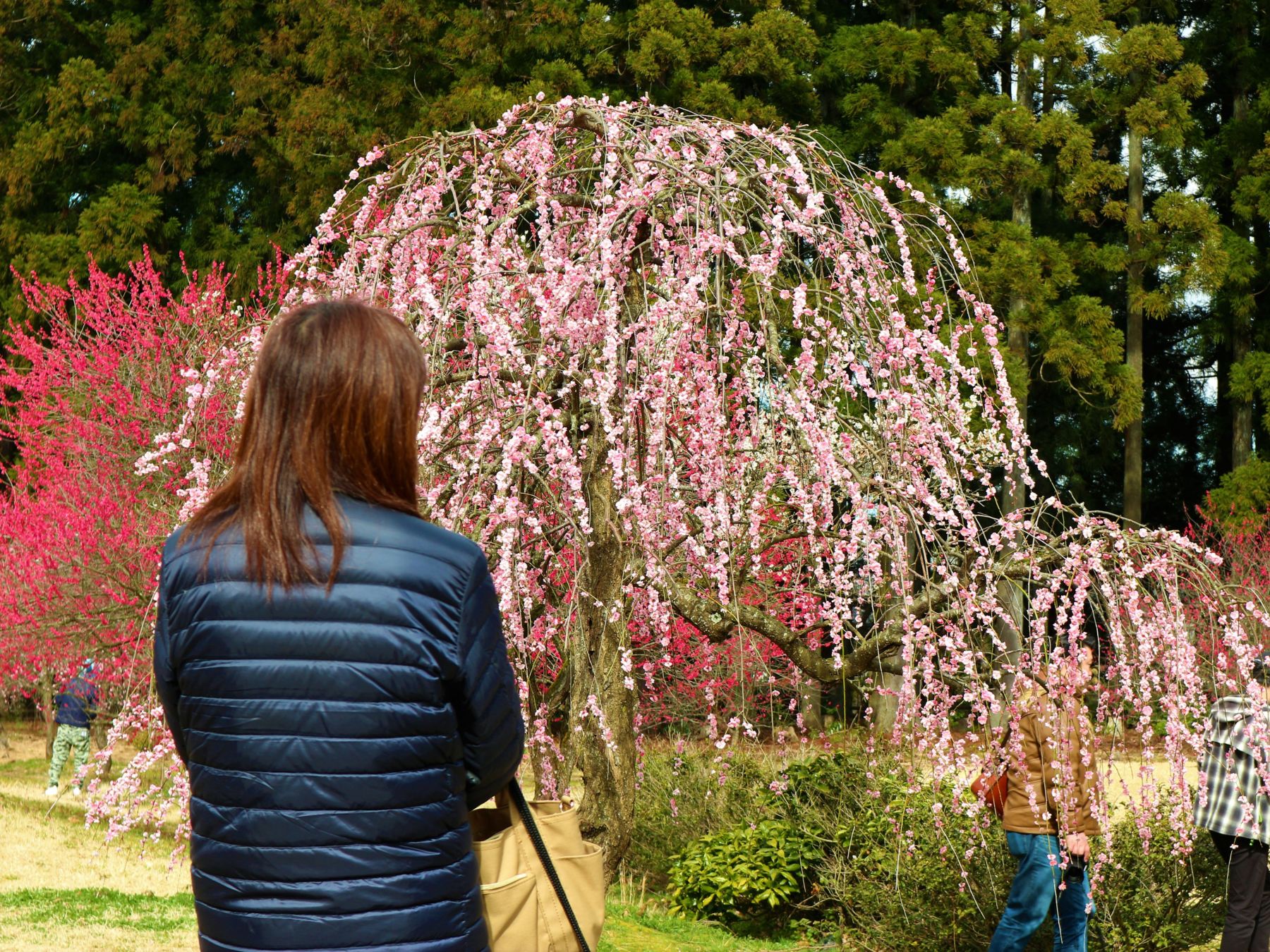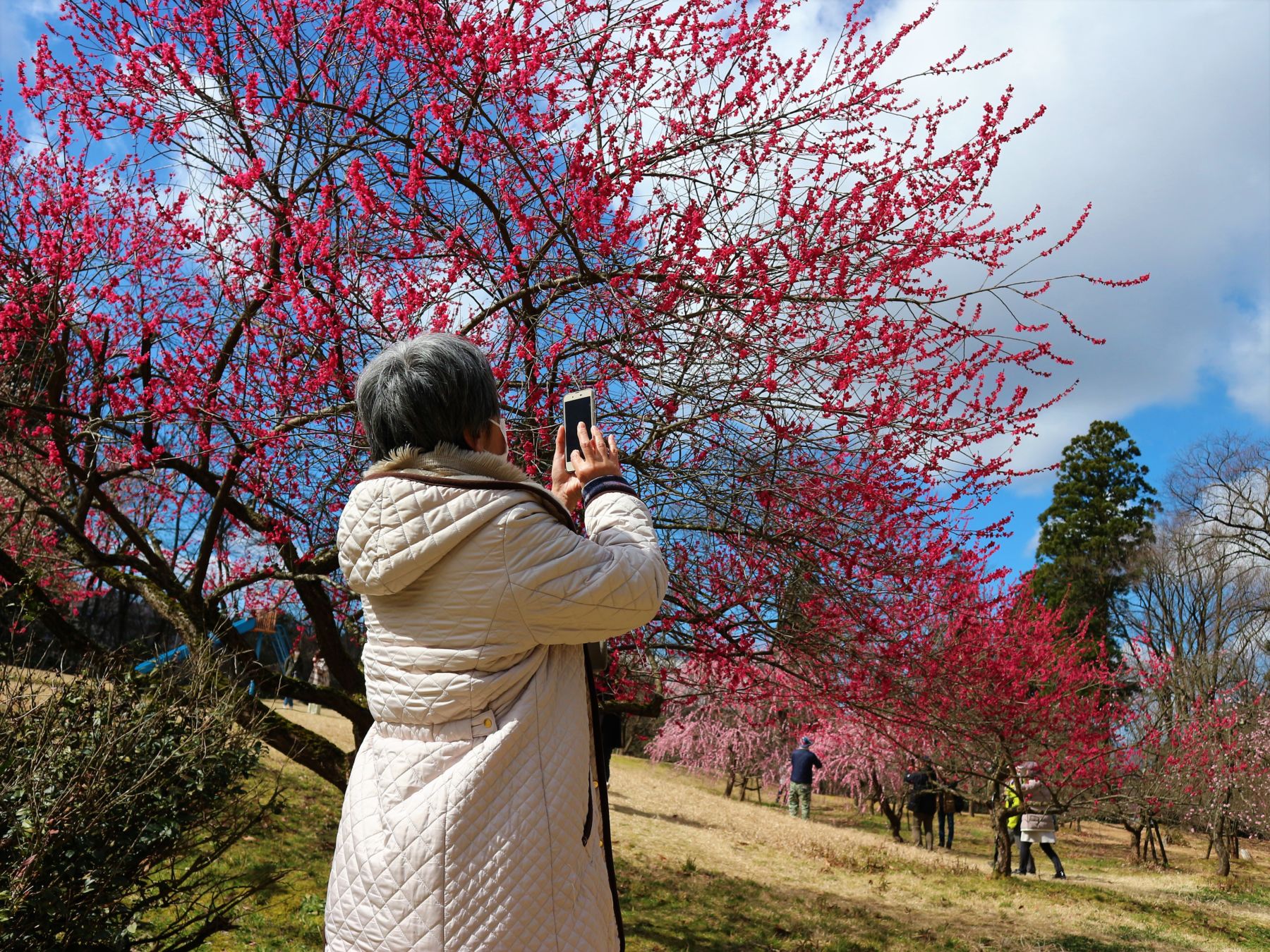 白やピンクの梅の花を、大勢の人たちが楽しんでいました。