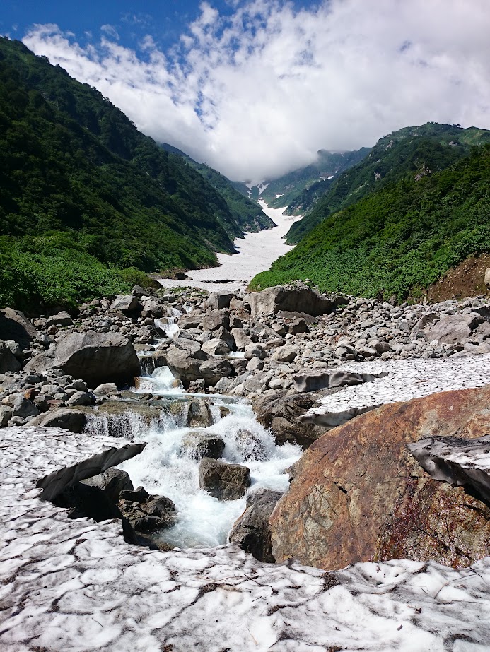 ですが、当時私が登った9月にはすでに雪渓は消え、沢登りとなりました。