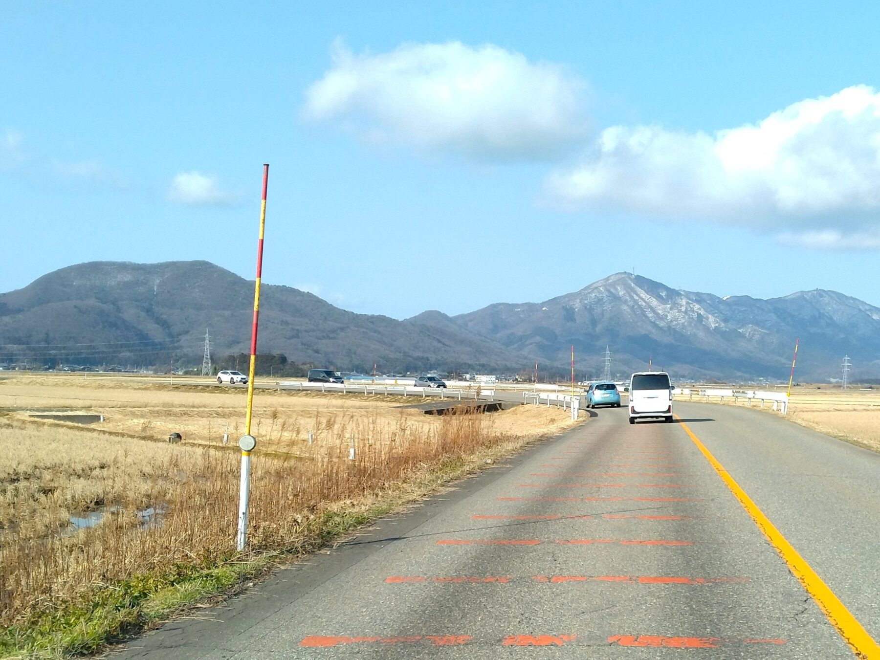 青空の下、雪で少し白くなった国上山や弥彦山を眺めながら車で会場へ向かいました。